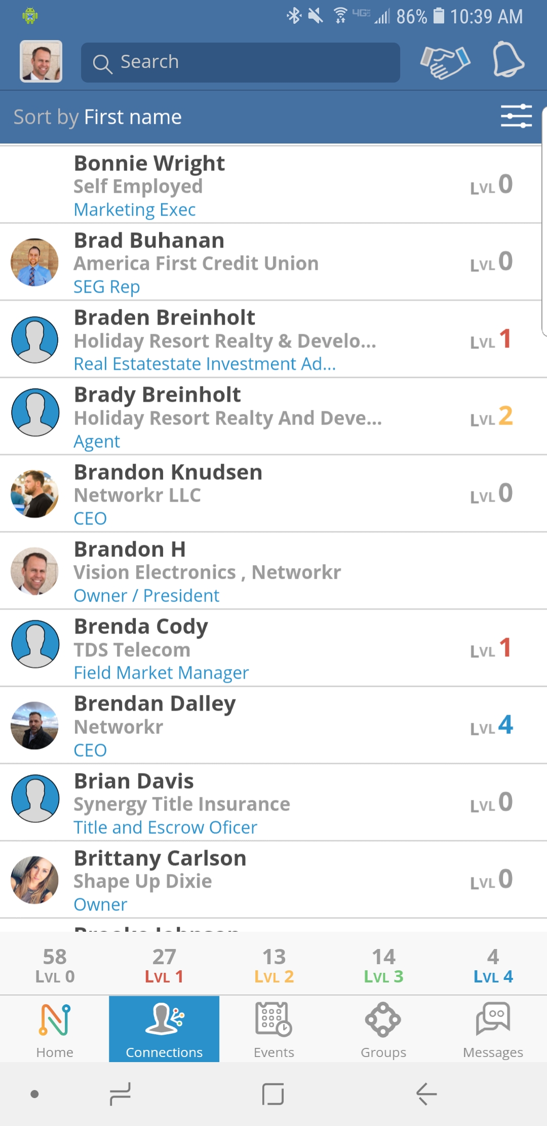 You can view each list by relationship level by pressing the LVL buttons located just below the contacts screen. As you can see Brandon went from a level 0 to a level 4.