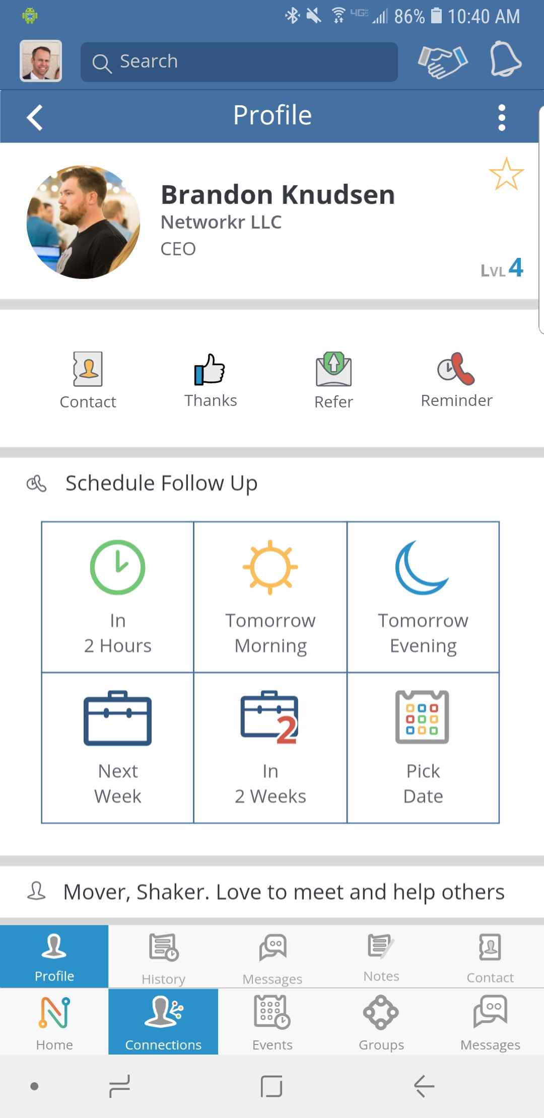 Set the level of your relationship with that person. 0 is a peer or someone who has attended an event with you. When you sit at a table Networkr will automatically assign a level 1 to those who are sitting next to you. It’s important to note that Networkr depends on your relationship levels to make sure you are meeting new people and buildingĀ  relationships. Keeping your levels up to date will guarantee you have the best networking experience possible.